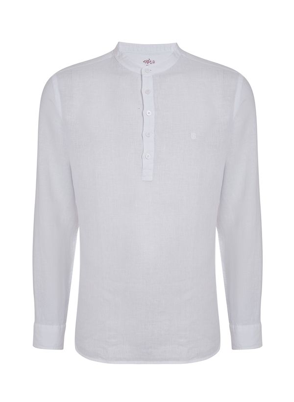 Confeccionada em linho, a Bata possui modelagem slim fit, gola padre, vista com botões, assinatura da marca em bordado, mangas longas com fechamento nos punhos e acabamento pespontado.