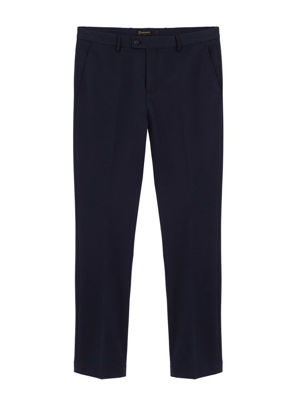 Confecicionada em malha, a Calça possui modelagem alfaiataria, cós com passantes, fechamento por botão e zíper, bolsos frontais modelo faca e acabamento pespontado.